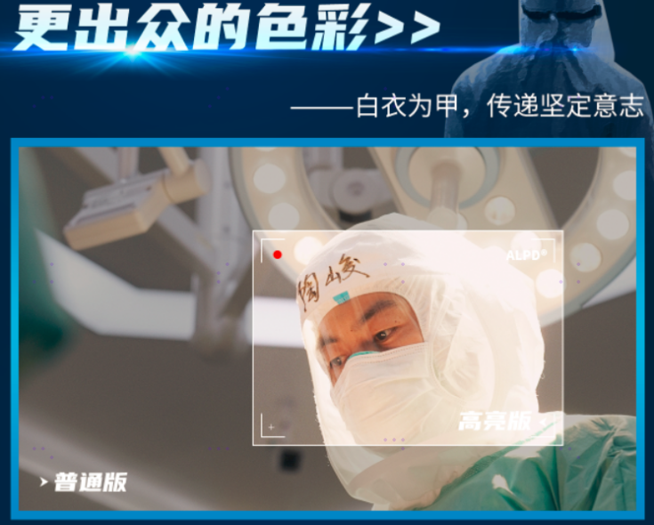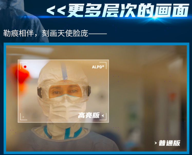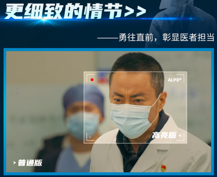 置身ALPD180%高亮版之下,每一處微小的細(xì)節(jié),每一絲微弱的變化,都將被你一一捕捉。即使在斷電的ICU(重癥加強(qiáng)護(hù)理病房),我們依舊清晰看到焦慮的表情、汗?jié)竦念^發(fā)、流入針管的血液,一瞬間你已經(jīng)置身于醫(yī)院的戰(zhàn)場,是旁觀者,也是參與者。從焦慮、質(zhì)疑、絕望到急迫、堅(jiān)定、希望,每一個(gè)身處風(fēng)暴中心的普通人,他們努力活下去的勇氣,經(jīng)過高亮的展現(xiàn)都更加令人動容。從觀影體驗(yàn)來看,ALPD激光高亮版并不只是高亮這么簡單,經(jīng)過層層的優(yōu)化,它還能帶來多層次的色彩,更加豐富和銳利的畫面,從而更加生動和真實(shí)地展現(xiàn)每一位參與這場戰(zhàn)爭的“平凡英雄”。在ALPD高亮版的《中國醫(yī)生》中,處處呈現(xiàn)出有質(zhì)感的細(xì)節(jié):臉頰壓出血色痕跡條條可見,汗水浸泡過皮膚呈現(xiàn)出來的發(fā)白到微微紅腫的層層遞進(jìn),最初城市的灰暗街景、霧氣彌漫,醫(yī)院被冷色調(diào)的光線籠罩,直至影片結(jié)尾部分晨光下的城市漸漸有了色彩,有了鮮活的顏色,畫稿上濃烈的藍(lán)色,小嬰兒的淡粉色,這都是屬于生命的色彩預(yù)示著希望,在ALPD高亮版更加深刻地展示了每一分色彩帶來的碰撞與變化,感悟生命的無限與逆行者的偉大。