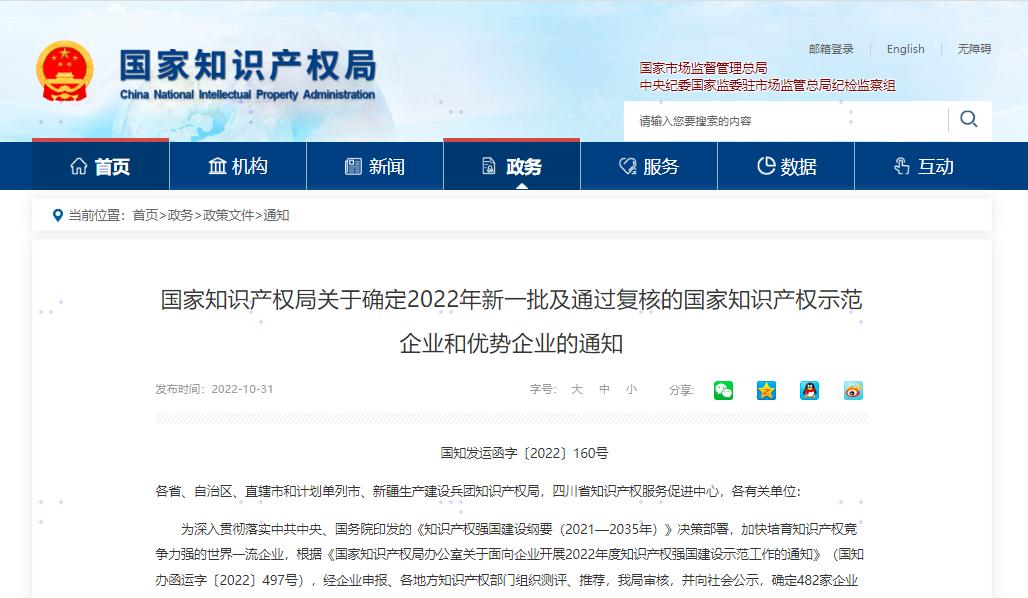10月31日,國(guó)家知識(shí)產(chǎn)權(quán)局官網(wǎng)正式發(fā)布《關(guān)于確定2022年新一批及通過(guò)復(fù)核的國(guó)家知識(shí)產(chǎn)權(quán)示范企業(yè)和優(yōu)勢(shì)企業(yè)的通知》。