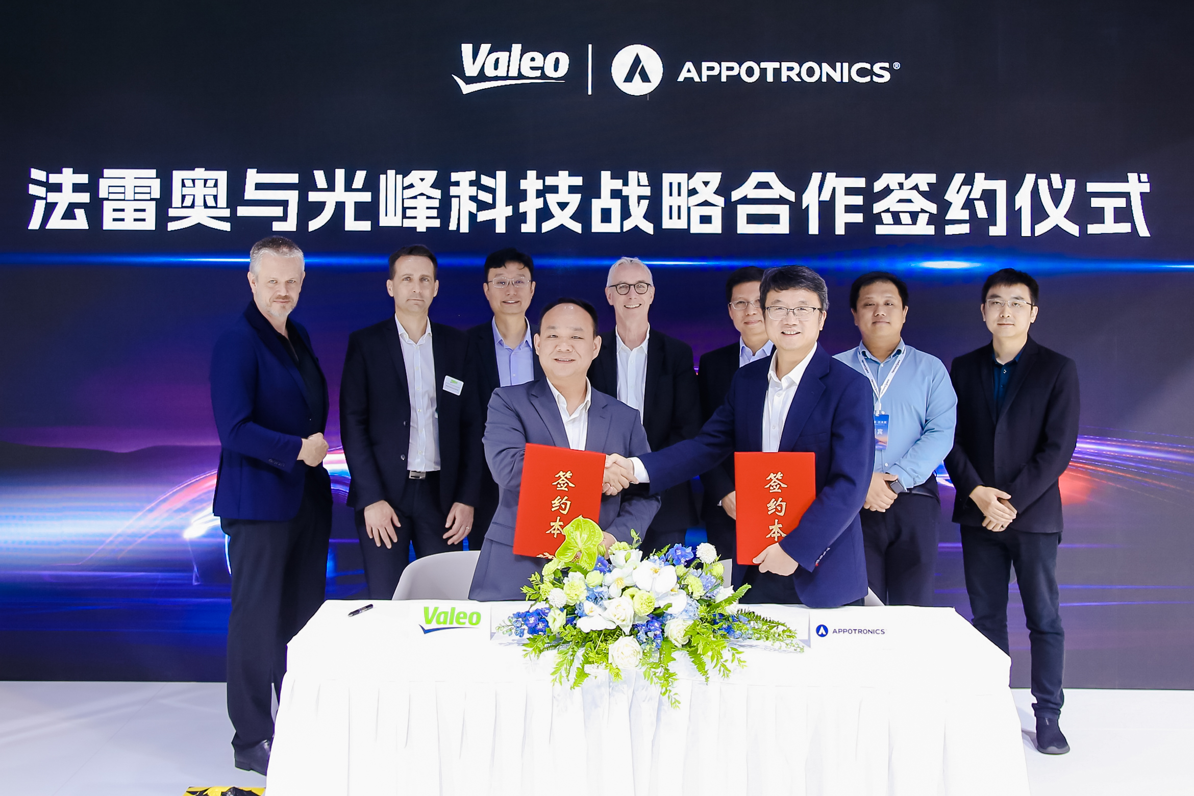 (前排左側(cè)為法雷奧照明系統(tǒng)中國區(qū)總裁張鋒,前排右側(cè)為光峰科技創(chuàng)始人、董事長、CEO李屹)