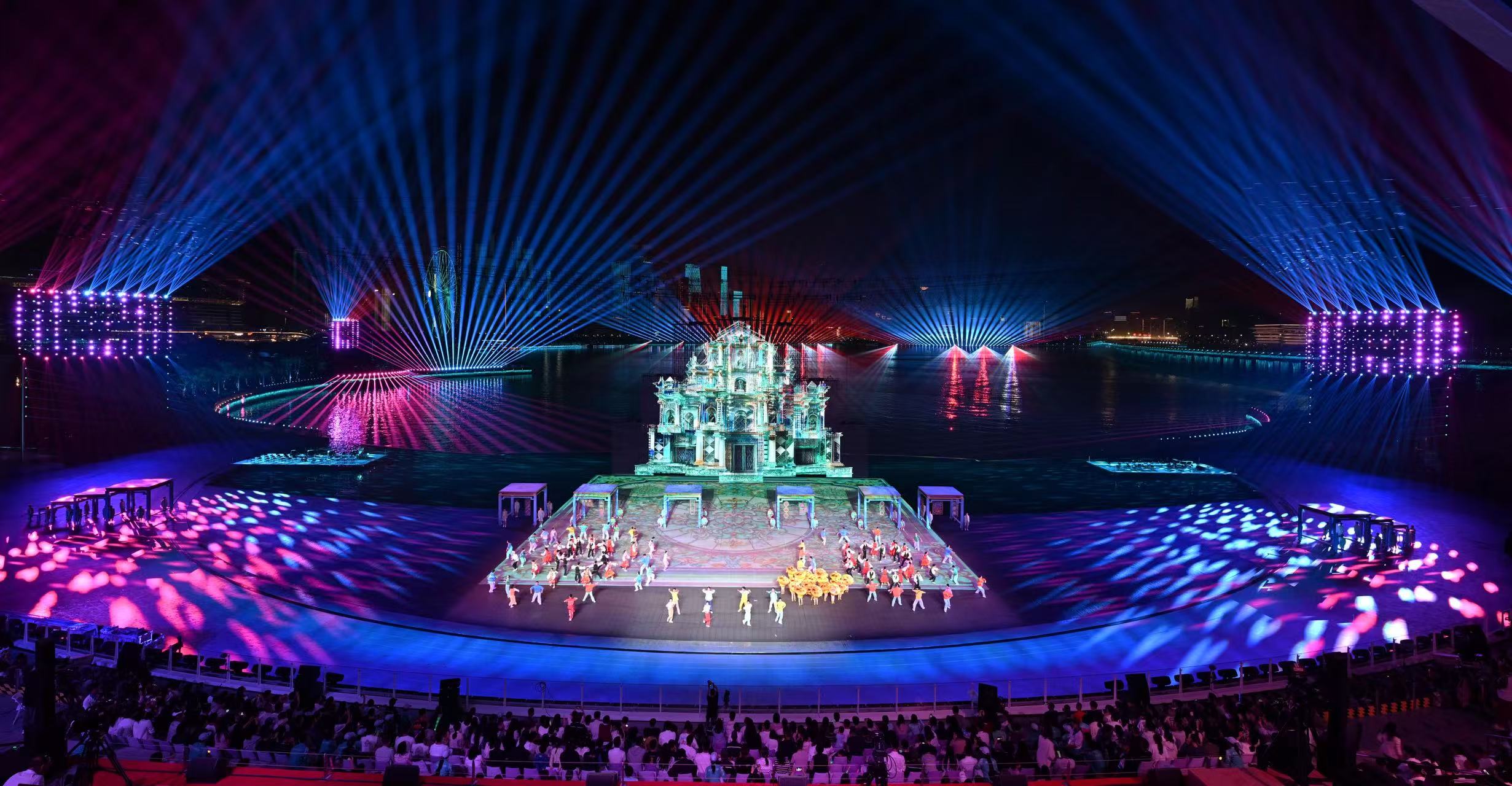 舞臺(tái)最大的亮點(diǎn)之一,就是創(chuàng)新性地將陸域看臺(tái)、水域舞臺(tái)與城市背景融為一體,打造出名副其實(shí)的“城市全景閉幕式”。而燈光則成為串聯(lián)這一切的“點(diǎn)睛之筆”,它將不同元素巧妙結(jié)合,最終構(gòu)成了這場(chǎng)震撼全場(chǎng)的視覺(jué)盛宴。