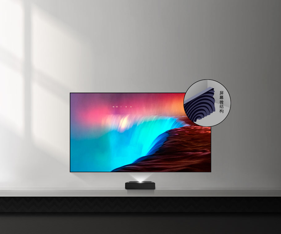 搭配上100英寸高端電視屏幕-Faulus F菲涅爾光學(xué)硬屏幕,主動(dòng)調(diào)節(jié)激光投影的光學(xué)走向,